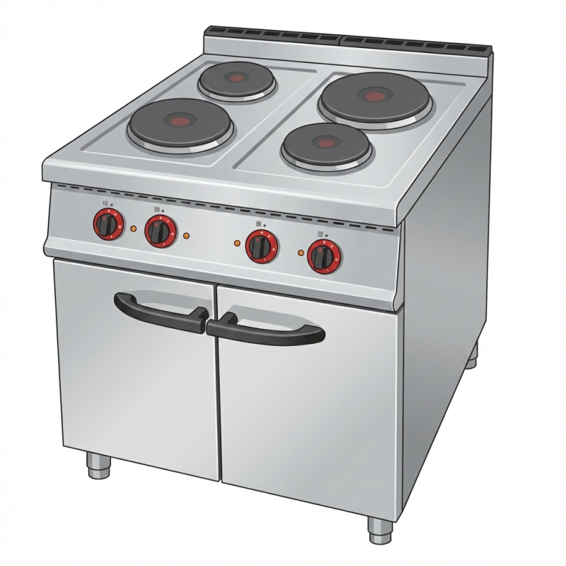 Profesjonalna kuchnia elektryczna 4-płytowa z podstawą szafkową.
